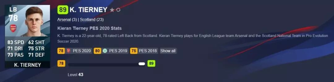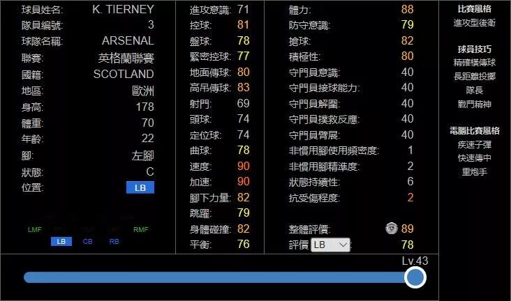 球员:基兰·蒂尔尼国籍:苏格兰球队:阿森纳模型:178cm/70kg/真脸风格:额外前锋总评:79—89技能:战斗精神,长距离投掷,精确横传球,队长