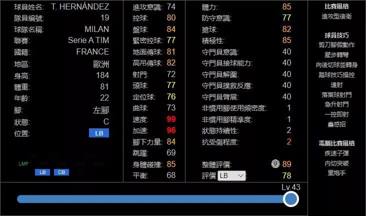 国籍:法国球队:AC米兰模型:184cm/81kg/真脸风格:进攻型后卫总评:78—89技能:落叶球射门,首次射球,向后切球并转身,插花假动作,远射,压步转弯,截击射门,踏球技巧操控,蛊惑招