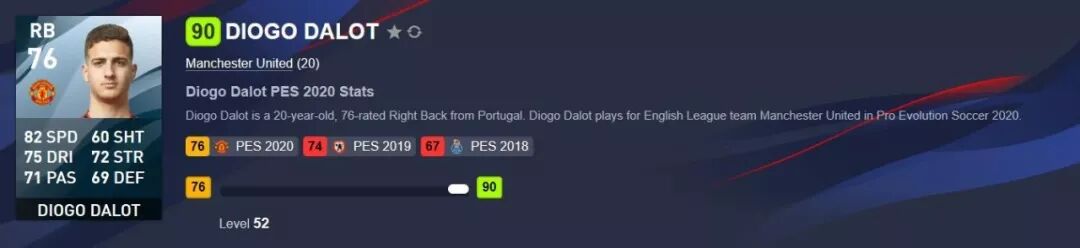 迪奥戈·达洛特在2018年夏天从波尔图转会加盟曼联,作为时任主帅穆里尼奥直接砸下2200万欧元签下的年轻小将,起初达洛特并没有受到太多球迷的关注,但是随着近两个赛季在英超赛场上的出色表现,达洛特的才能也被大家所关注,虽然还未能成为球队首发名单中稳定的一员,但是他所具有的潜力,让红魔曼联期待未来,达洛特兑现天赋的时刻。在pes2019中,还只是铜球的达洛特就凭借着出色的进攻能力受到大家的关注。新赛季,满级总评并列位居银球右后卫榜首的达洛特,逐渐成为玩家妖人阵中的主力选择之一。相比于亨里希斯的攻守均衡,达洛特的特点在于他出色的进攻能力与积极的前场压迫。81+84的盘控,80+82的双传,91+90的双速,与此同时还有着比较可观的80+77的对抗和平衡。搭配上精确横传球的技能和87的积极性,达洛特在场上会倾向于积极的前插助攻,并在中场附近的区域进行扫荡拦截。但是他的缺点也很明显,防守ai仅有78,抢球数值也仅有76,这样的偏科数据导致他在防守端的表现并不如进攻端出色。